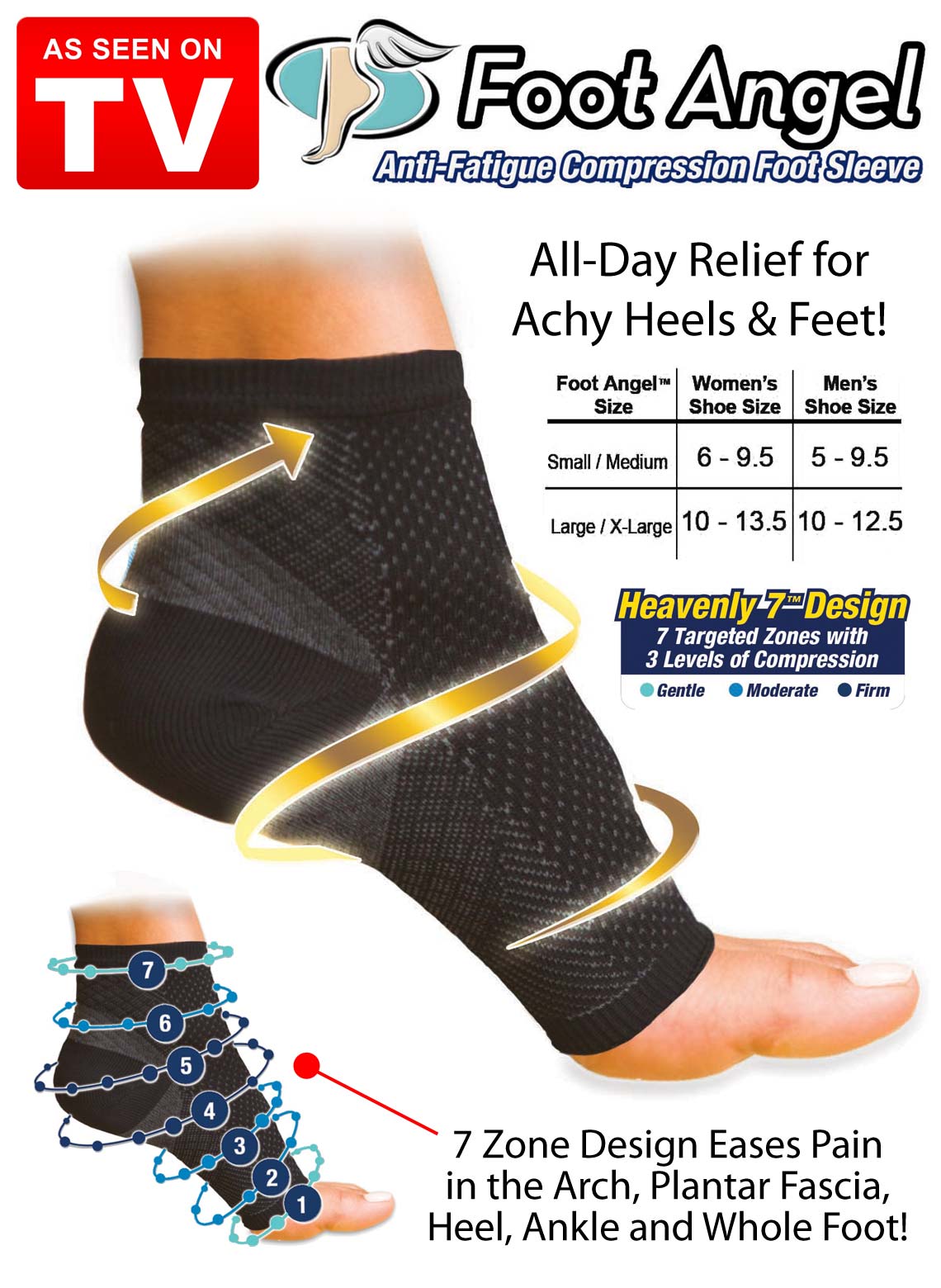 Foot Angel is a compression sleeve for your foot and ankle. Provides support, relieves pain, reduces swelling, and improves circulation.
