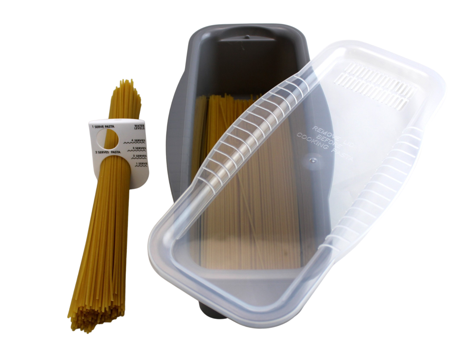 The Microwave Pasta Cooker allows you to make perfectly portioned pasta in minutes! Features a serving measure tool so you know exactly how much you're making plus a drain lid so you don't have to use a separate colander. Cooks up to 4 servings at one time.
